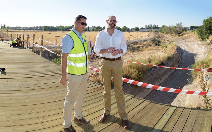 El alcalde, Pedro Ángel Jiménez, junto a los concejales de Cultura y Medio Ambiente, José Antonio Navarro y Enrique Peces, respectivamente, visitaron las obras de instalación de la pasarela, acompañados del director técnico de la misma, Eduardo Rubio, de la empresa adjudicataria Grupo TREBOL 5 – Servicios de Ingeniería y Arquitectura S.L.; durante la cual el alcalde destacaba que esta nueva infraestructura forma parte de un proyecto “muy bonito”, dentro del cual se han reforestado más de 200 árboles en toda la vía verde y se irá completando con mobiliario urbano, siendo la próxima inversión un parque de calistenia.