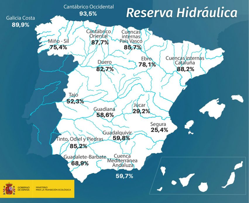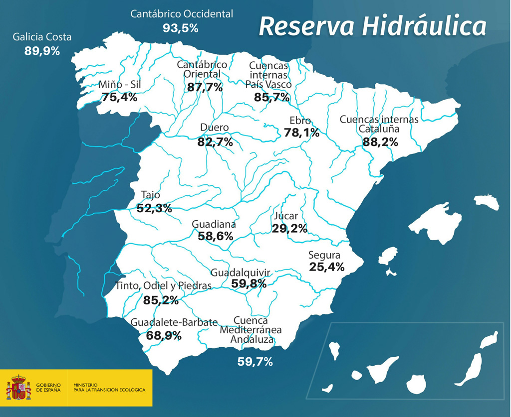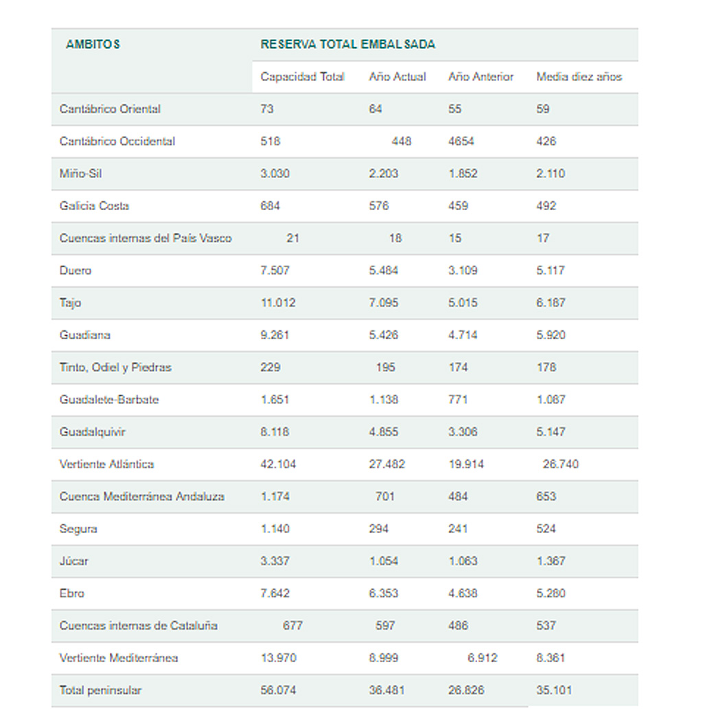 La reserva hidráulica española está al 65,1 por ciento de su capacidad total. Los embalses almacenan actualmente 36.481 hectómetros cúbicos (hm³) de agua, disminuyendo en la última semana en 556 hm³ (el 1,4 % de la capacidad total de los embalses).
