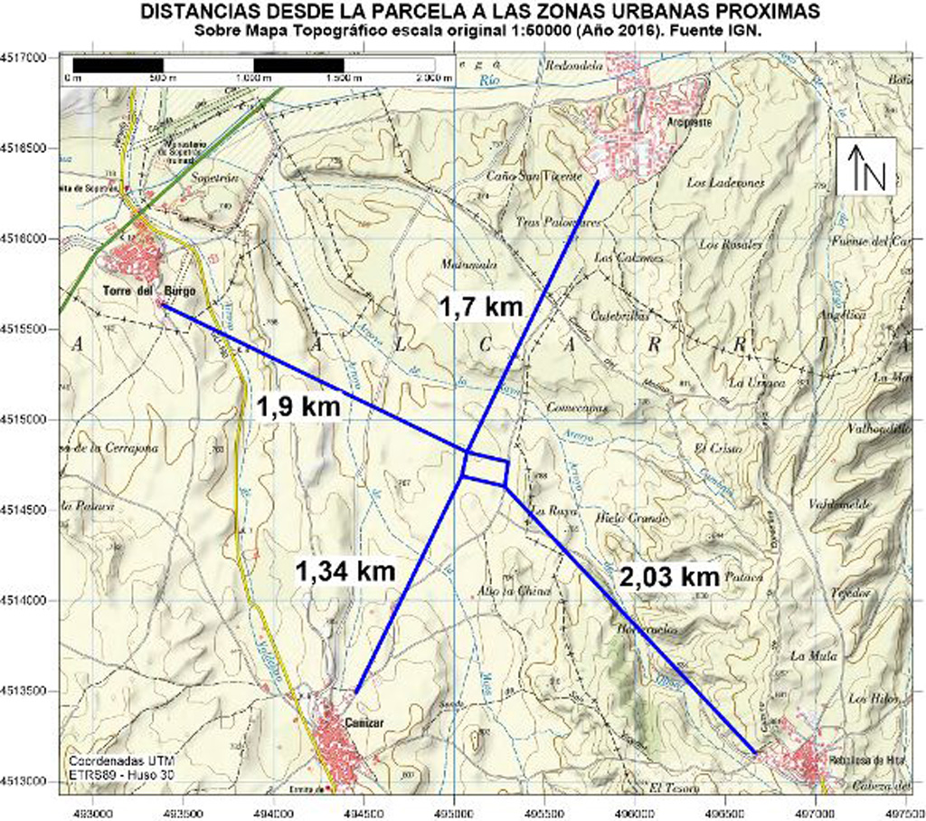 La macrogranja se sitúa a 1.300 metros de Cañizar; a 1.700 de la Urbanización Arcipestre de Hita; a 1.900 de Torre del Burgo y a 2.000 de Rebollosa de Hita.