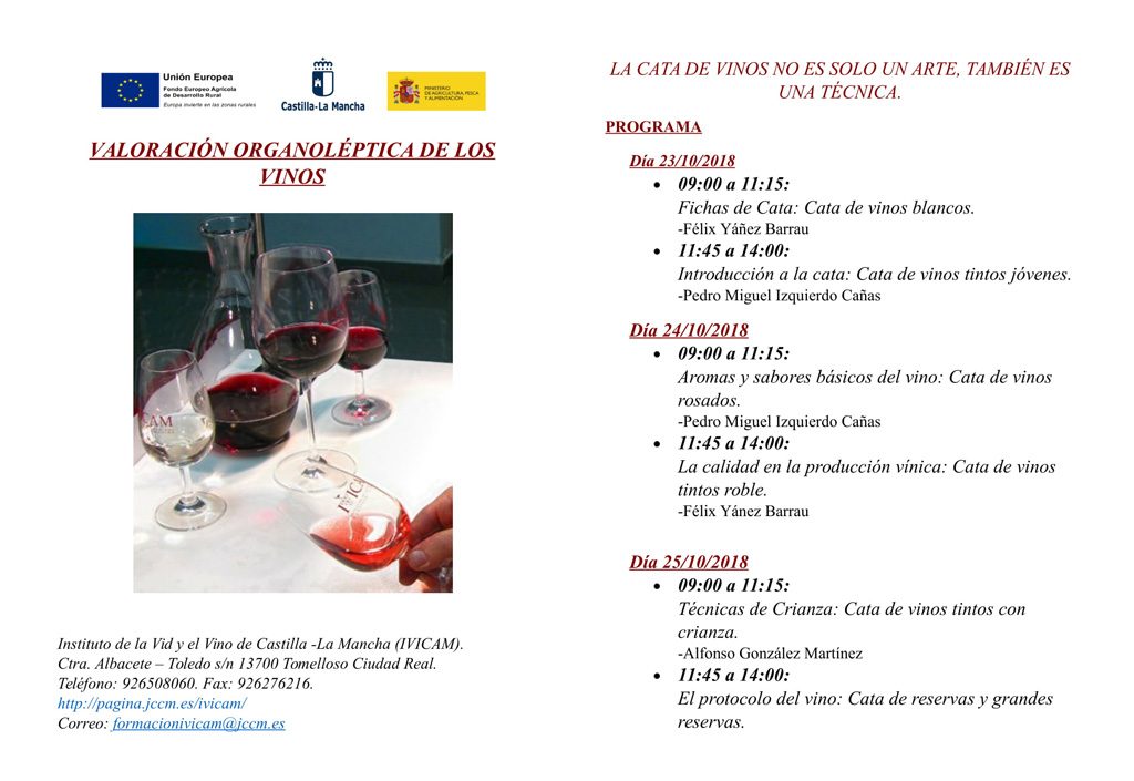 El Instituto de la Vid y el Vino de Castilla-La Mancha, con sede en Tomelloso (Ciudad Real), acogerá los días 23, 24 y 25 de octubre, un curso sobre valoración organoléptica de los vinos, que incluirá fichas de cata de vinos blancos, rosados y tintos roble a cargo de Félix Yáñez Barrau, Jefe de sección del Instituto Regional de Investigación y Desarrollo Agroalimentario y Forestal de Castilla-La Mancha (IRIAF) y Pedro Miguel Izquierdo Cañas, que se encargarán también, junto con Alfonso González Martínez, de las ponencias incluidas en el programa.