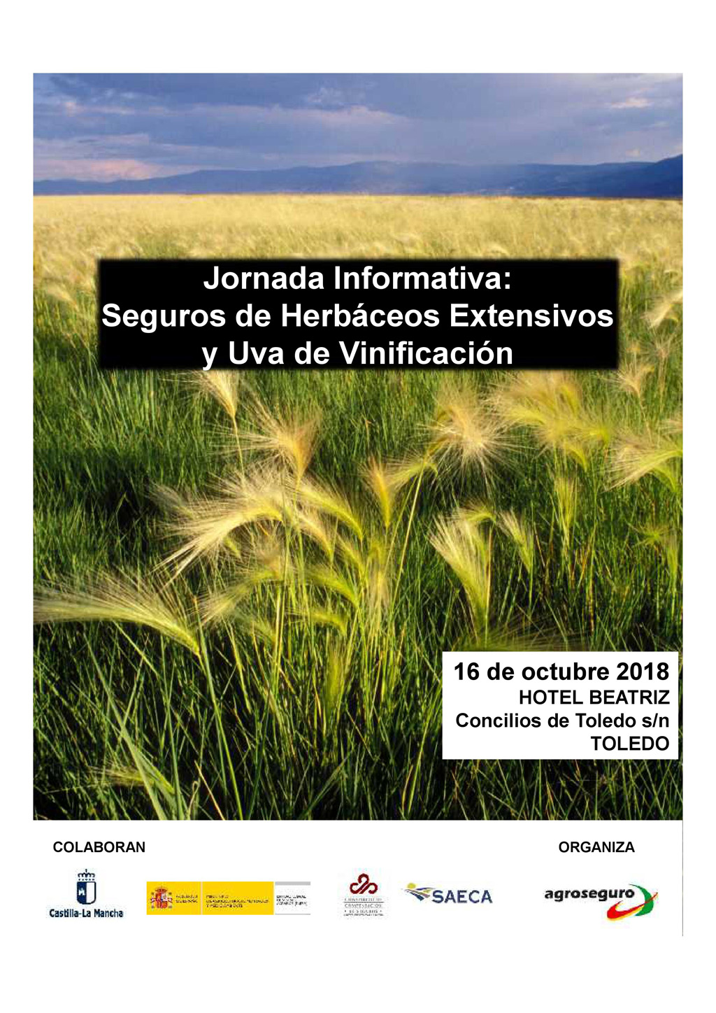 Agroseguro ofrecerá el martes 16 de octubre en el Hotel Beatriz de Toledo una jornada informativa sobre “Seguros de Herbáceos Extensivos y Uva de Vinificación”. Desde las 10:30 hasta las 13:45 horas se realizarán diferentes ponencias que contribuirán a un mayor conocimiento sobre estos dos seguros, así como sobre las mejoras introducidas en ambos para la contratación del Plan 2018.