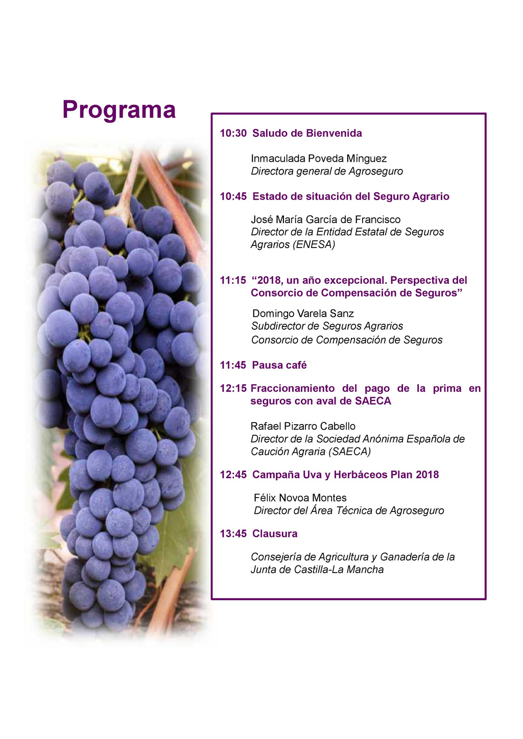 Finalmente, Félix Novoa, director del Área Técnica de Agroseguro hablará sobre la campaña de uva y herbáceos del Plan 2018.