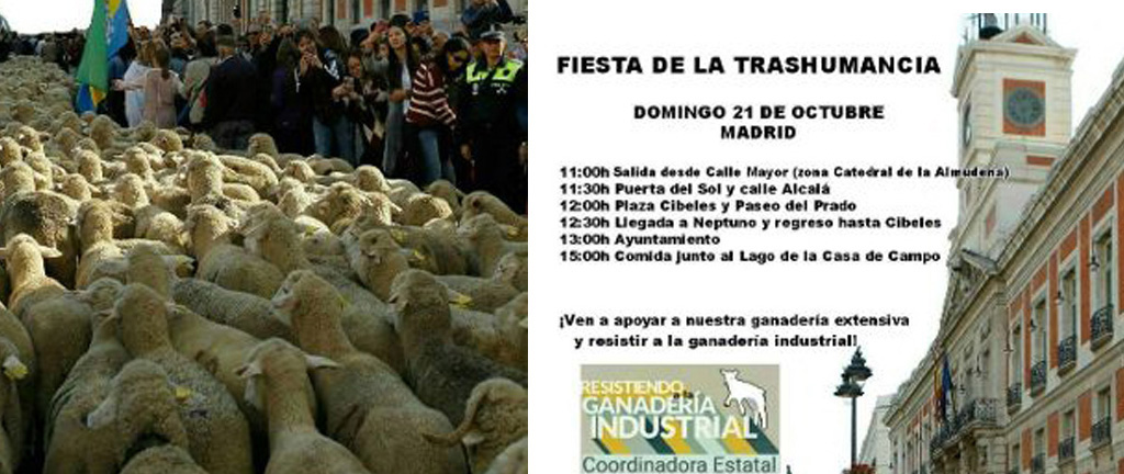 Representantes de movimientos vecinales de defensa del territorio ante la amenaza de la ganadería industrial de diversos puntos de España como Aragón, Castilla-La Mancha, Castilla y León, Murcia y Andalucía, se suman al recorrido del rebaño trashumante por el centro de Madrid el domingo 21 de octubre bajo el lema “Sí a la trashumancia. Stop macrogranjas”.