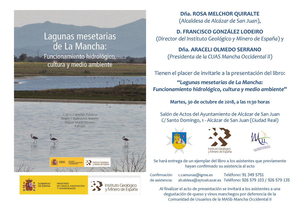 El Director del Instituto Geológico y Minero de España (IGME), D. Francisco González Lodeiro, la Alcaldesa de Alcázar de San Juan, Dña. Rosa Melchor Quiralte y la Presidenta de la Comunidad de Usuarios de la Masa de Agua Subterránea Mancha Occidental II, Dña. Araceli Olmedo Serrano, presentarán el próximo 30 de octubre, a las 11:30 h,en el Salón de Actos del Ayuntamiento de Alcázar de San Juan, C/ Santo Domingo, 1 – Alcázar de San Juan (Ciudad Real), la publicación, editada por el IGME, titulada: “ Lagunas mesetarias de La Mancha: funcionamiento hidrológico, cultura y medio ambiente ”.
