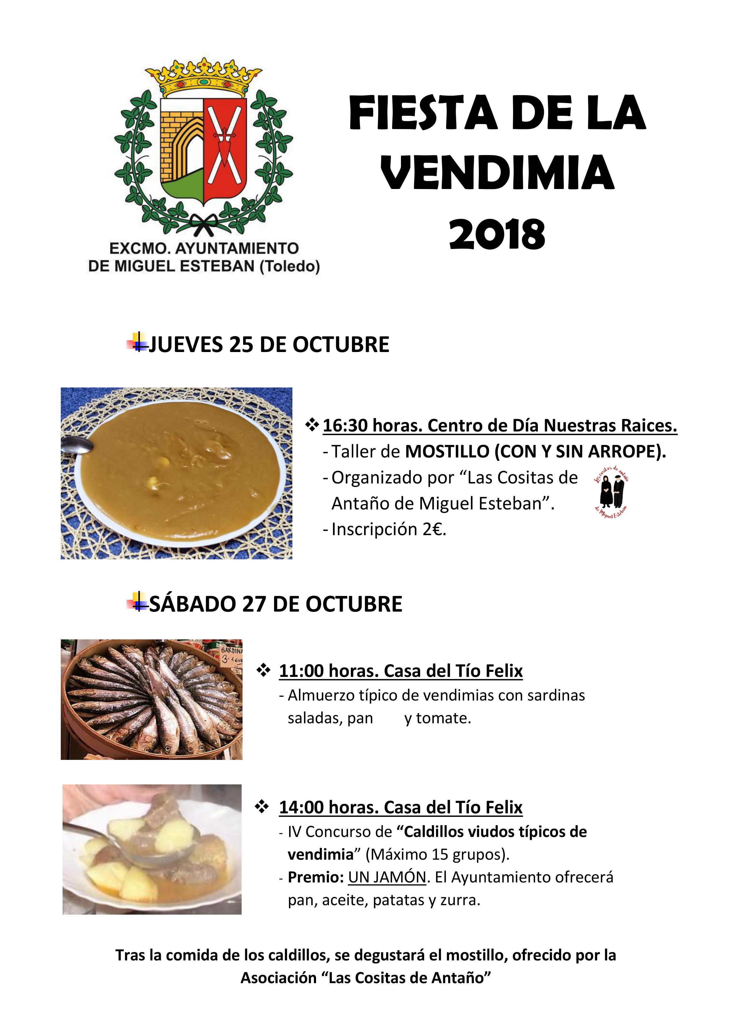 Este mismo día, a las dos de la tarde, también en la Casa del Tío Félix, tendrá lugar el IV Concurso de ‘Caldillos viudos típicos de vendimia’, en el que podrán participar un máximo de 15 grupos. El Ayuntamiento ofrecerá el pan, el aceite, las patatas y el zurra a todos los grupos participantes para que puedan elaborar este plato típico. El cocinero del caldillo ganador será obsequiado con un jamón como premio. Tras la comida de los caldillos, se degustará un mostillo ofrecido por la Asociación ‘Las Cositas de Antaño’.