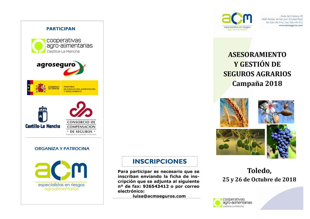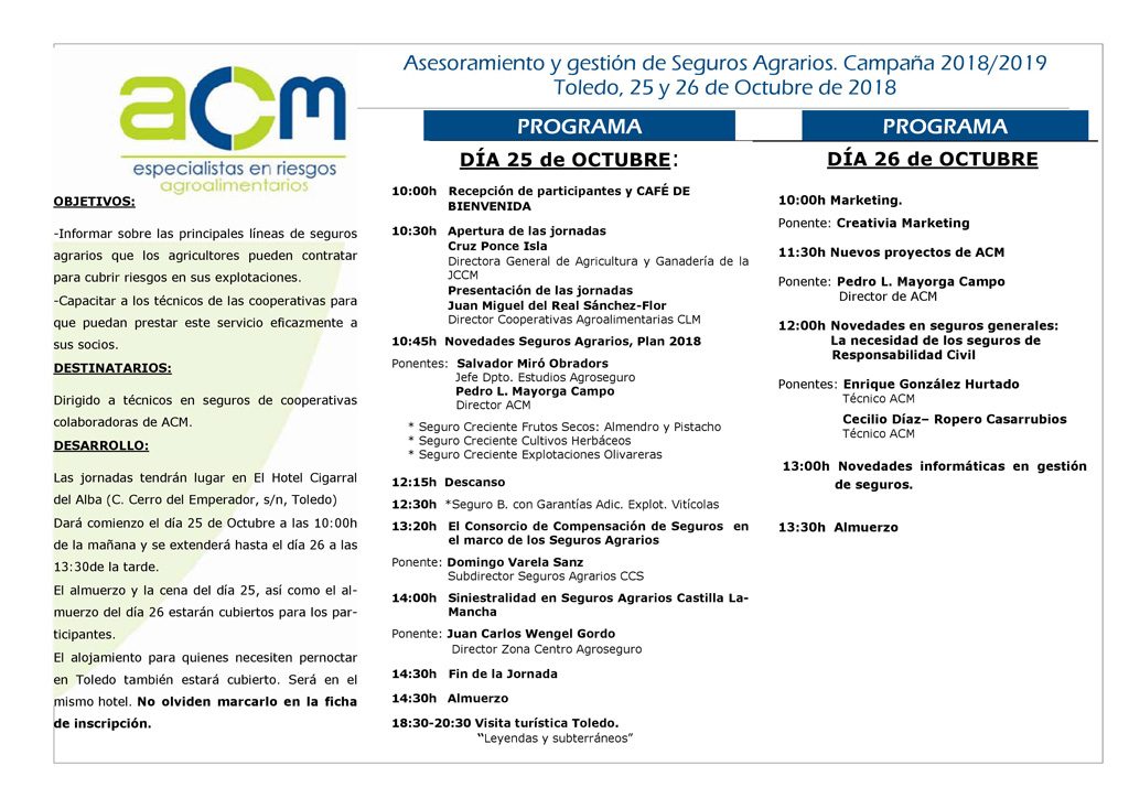 ACM, Especialistas en Riesgos Agroalimentarios -la correduría de seguros de Cooperativas Agro-alimentarias Castilla-La Mancha- organiza este jueves en el Hotel Cigarral del Alba, en Toledo, la jornada “Asesoramiento y gestión de Seguros Agrarios. Campaña 2018/2019”, que tendrá a partir de las 10:30 horas, y que se prolongará hasta el viernes por la mañana.