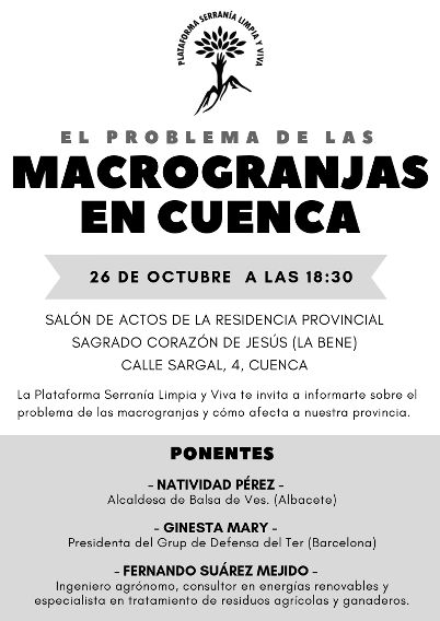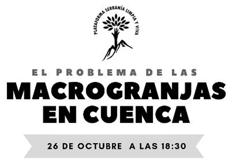 La Plataforma Serranía Limpia y Viva, creada por vecinos de los municipios conquenses de Portilla, Villalba de la Sierra y Zarzuela afectados por la instalación de una macrogranja en éste último municipio, organiza una jornada informativa sobre macrogranjas que tendrá lugar este viernes, a las 18:30 horas, en el Salón de Actos de la Residencia Provincial Sagrado Corazón de Jesús, calle Sargal, 4, de Cuenca.