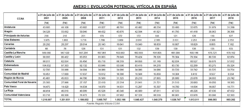 En este sentido, el mecanismo de nuevas autorizaciones está limitado anualmente a un máximo del 1% de la superficie vitícola nacional plantada, equivalente a unas 9.500 hectáreas cada ejercicio. Sin embargo, el Ministerio, aconsejado por la Organización Interprofesional del Vino de España, señala que se autoricen solo nuevas plantaciones aproximadamente por la mitad de esa superficie, cuando, según Unión de Uniones, no sería ningún problema para el mercado llegar al 100%, máxime cuando el potencial vitícola español se ha reducido en un 18,3 % desde el 2001, con 14.505 hectáreas perdidas por esta vía de limitación a nivel estatal desde el 2016.