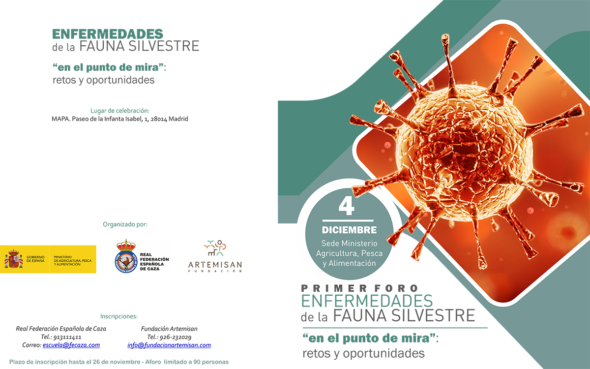 El Ministerio de Agricultura, Pesca y Alimentación (MAPA), junto con la Real Federación Española de Caza (RFEC) y la Fundación Artemisan (FA) celebrarán el 4 de diciembre, en Madrid, el ‘I Foro sobre enfermedades de fauna silvestre. Retos y oportunidades’. Se trata de un encuentro dirigido a cazadores, propietarios y titulares de cotos, técnicos de las administraciones competentes en caza y sanidad animal y gestores.