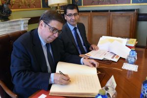 En otro orden de cosas, el Ministro de Agricultura, Pesca y Alimentación, que ha inaugurado en el Palacio Provincial una exposición sobre Campañas Publicitarias del Ministerio Durante la Etapa Constitucional, con motivo del 40 aniversario de la Carta Magna, ha firmado en el Libro de Honor de la Diputación.
