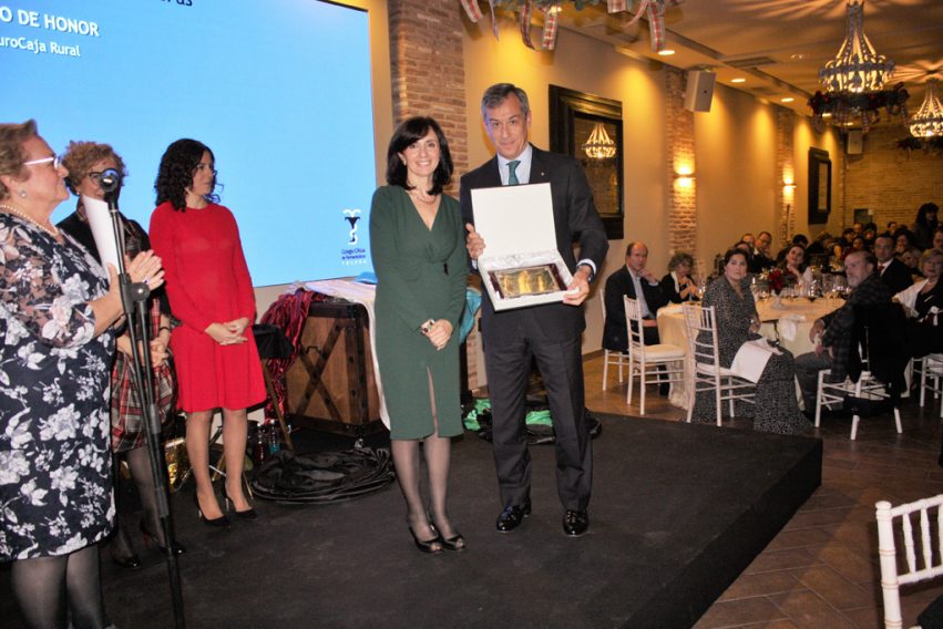 El presidente de Eurocaja Rural, Javier López Martín, recibió este título honorífico de manos de la presidenta del Colegio, Ana María Rodríguez, en la Cena de Hermandad y Entrega de Distinciones celebrada en el Cigarral del Ángel Custodio de Toledo por la festividad de la patrona de los farmacéuticos, la Inmaculada Concepción.