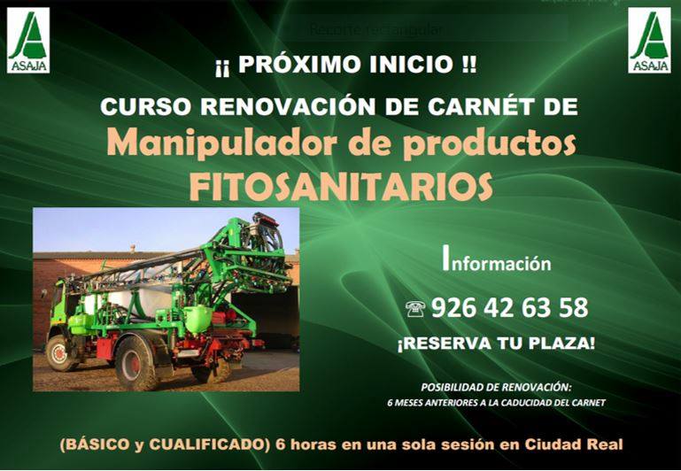 La Asociación Agraria-Jóvenes Agricultores (ASAJA) Ciudad Real impartirá el 9 de enero en la capital un curso para la renovación del carné de manipulador de productos fitosanitarios (nivel básico y cualificado). Desde la organización agraria recuerdan que las plazas son limitadas y que la fecha límite de matriculación y pago es el 4 de enero. El curso tiene una duración de 6 horas y en caso de existir una demanda suficiente en alguna localidad determinada se plantearán la realización de cursos en dicho municipio o comarca.