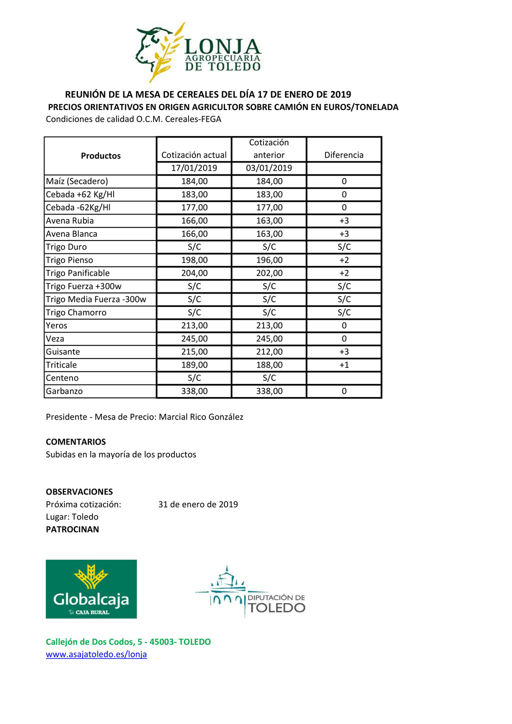 Lonja agropecuaria de Toledo. Mesa de Cereales del día 17 de enero de 2019