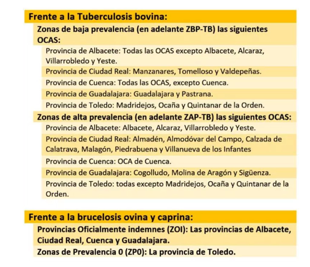 Igualmente, se prórroga en 2019, en cuanto a la brucelosis ovina-caprina, la prohibición de vacunar contra Brucella mellitensis en las explotaciones de ovino y caprino M3 en toda Castilla-La Mancha. Además, Albacete, Ciudad Real, Cuenca y Guadalajara se califican como Oficialmente Indemnes y Toledo se marca de prevalencia 0.
