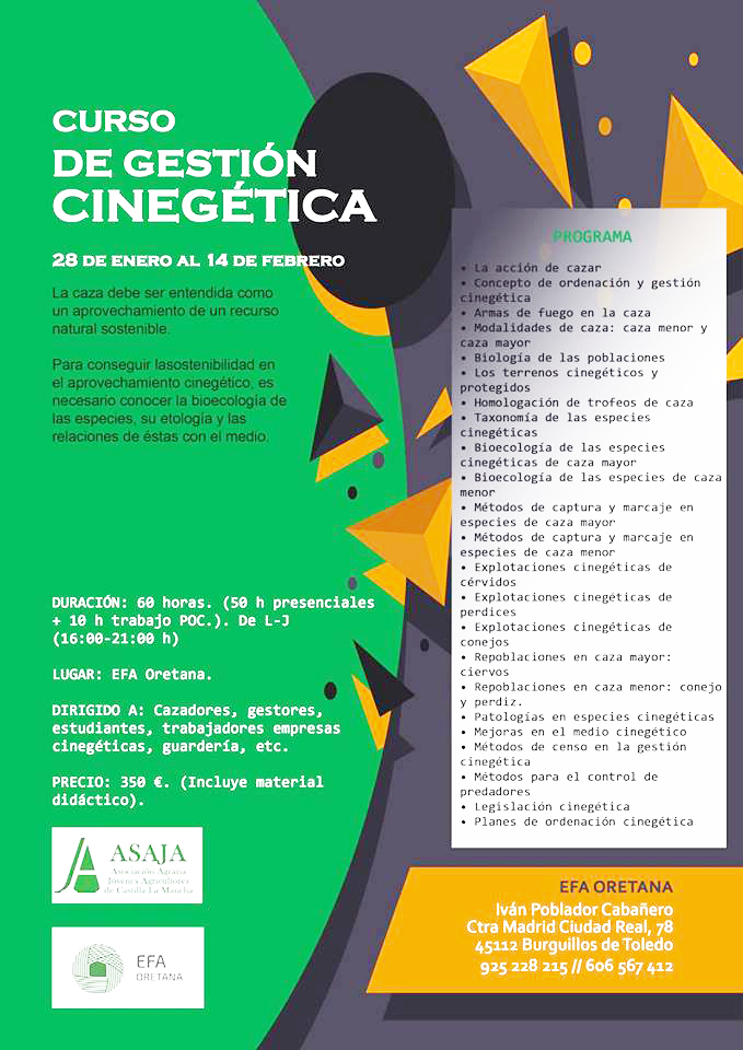 La Asociación de Jóvenes Agricultores (ASAJA) de Castilla-La Mancha y la Escuela Familiar Aagraria Oretana (Burguillos de Toledo –Toledo-) han organizado un Curso de Gestión Cinegética, de 60 horas (50 horas presenciales y diez de trabajo POC) que se desarrollará en las instalaciones de la EFA, el 28 de enero al 14 de febrero, de lunes a jueves, de 16:00 h. a 21:00 h.
