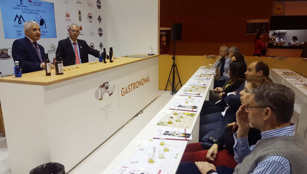 Los visitantes del stand de Castilla-La Mancha en FITUR han tenido la oportunidad, esta mañana, de aprender a distinguir el sabor de un buen aceite de oliva virgen extra de otros tipos de aceite que están en el mercado, durante la cata realizada por el director de la DOP Montes de Toledo, Enrique García-Tenorio.