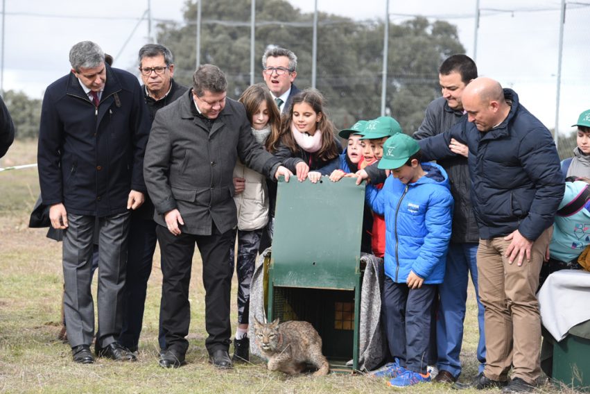 El jefe el Ejecutivo regional, acompañado por el consejero de Agricultura, Medio Ambiente y Desarrollo Rural, Francisco Martínez Arroyo, y de un centenar de alumnos del Colegio Público ‘Nuestra Señora del Sagrario’ de Mazarambroz, han abierto la puerta para que Planeta y Pupila, macho y hembra de un año de edad, ejemplares procedentes del centro de cría en cautividad de ‘La Olivilla’ en Jaén y del Zoobotánico de Jerez de la Frontera (Cádiz), comiencen su nueva vida en libertad en esta área de reintroducción de Castilla-La Mancha. En el acto también han estado presentes el alcalde de Mazarambroz y director general de Desarrollo Rural, José Manuel Martín Aparicio; los propietarios de esta finca privada, José y Rafael Finat, así como el presidente de la Diputación de Toledo, Álvaro Gutiérrez; el delegado de la Junta en Toledo, Javier Nicolás o el director general de Política Forestal y Espacios Naturales, Rafael Cubero.