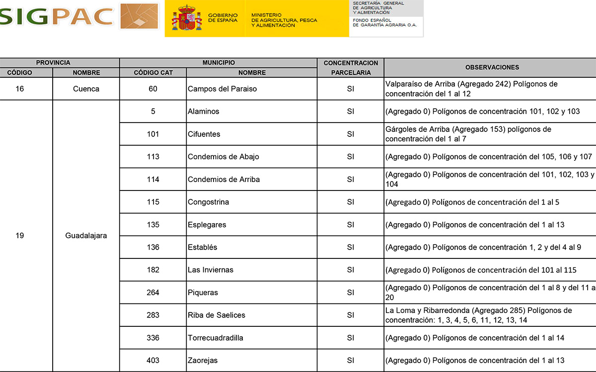 El Fondo Español de Garantía Agraria (FEGA) ha publicado la lista de los municipios que contarán con referencias diferentes al sistema de información geográfica de parcelas agrícolas (Sigpac) para cobrar las ayudas de la Política Agrícola Común (PAC) de la campaña 2019.
