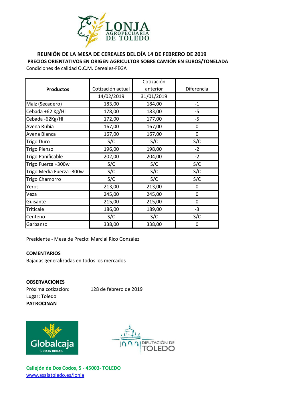 Lonja Agropecuaria de Toledo. Mesa de Cereales del Día 14 de febrero de 2019