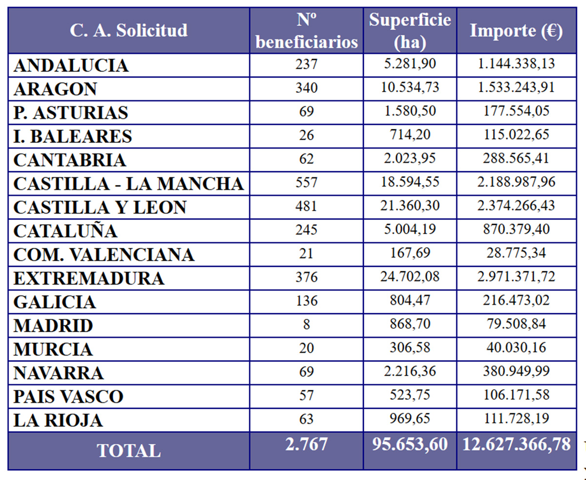 En Castilla-La Mancha hay 557 beneficiarios, 18.594 hectáreas y un importe de 2.188.987 millones de euros