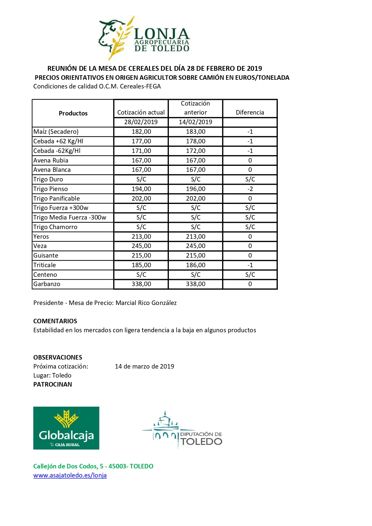Lonja Agropecuaria de Toledo. Mesa de Cereales 28-febrero-2019