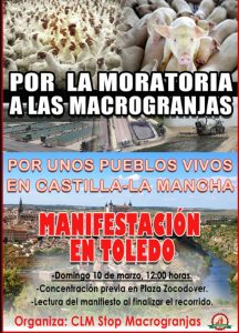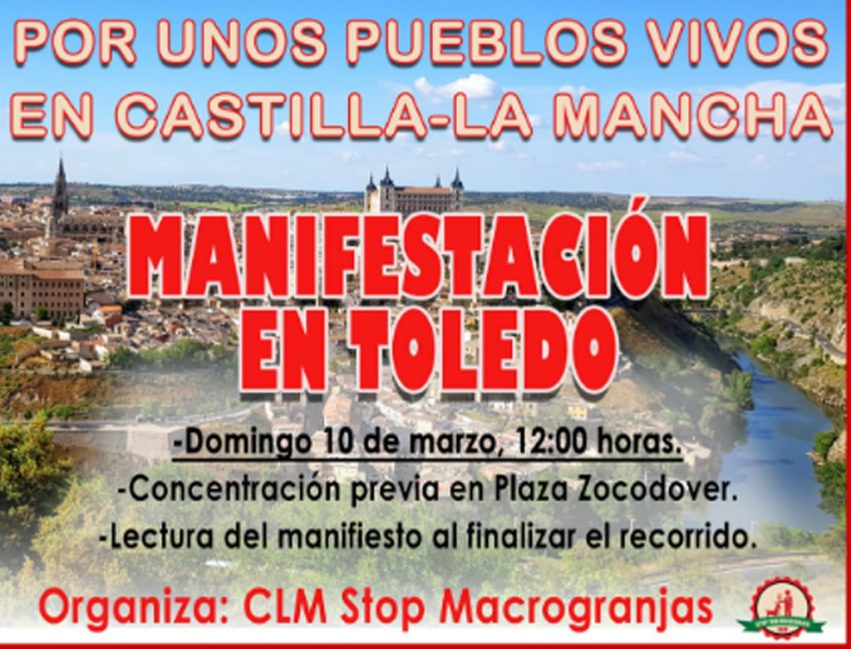 Desde Stop Macrogranjas afirma que los pueblos de Castilla-La Mancha «no cesan en sus reivindicaciones por mantener sus pueblos libres de la amenaza de la ganadería industrial». Por eso, este próximo domingo 10 de marzo, a las 12:00 de la mañana, se concentrarán en la plaza Zocodover de la capital toledana, desde donde marcharán, pasando por las calles Comercio, Hombre de Palo, Nuncio Viejo, Cardenal Lorenzana, Plaza San Vicente, calle La Plata, Toledo de Ohio, y vuelta por la Calle Comercio, para regresar a la Plaza Zocodover donde se leerá un manifiesto.