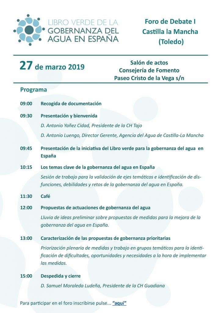La Consejería de Fomento de Castilla-La Mancha acogerá el miércoles 27 de marzo el I Foro de Debate sobre el ‘Libro verde de la gobernanza del agua en España’. Será a partir de las 9:00 horas en el Paseo Cristo de la Vega, s/n.