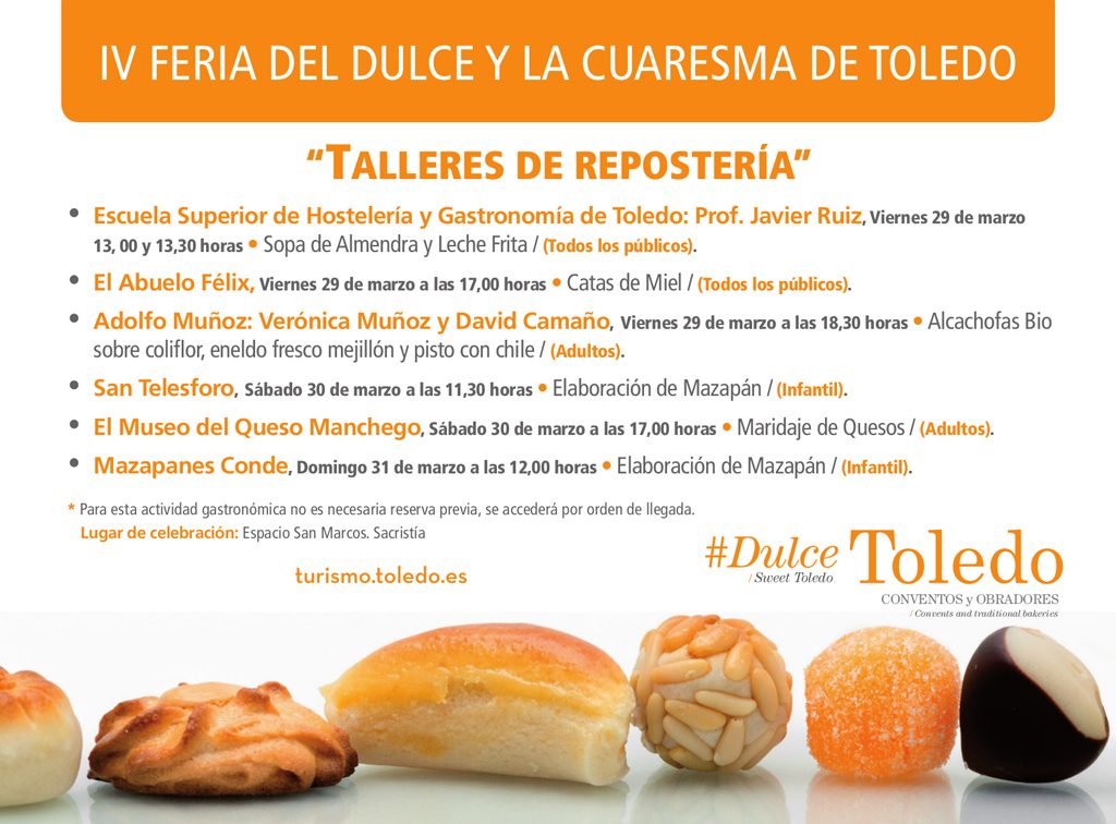 La IV Feria del Dulce contará con más de veinte expositores de diferentes empresas de la capital y la provincia, entre pastelerías, obradores, chocolaterías, heladerías, licorerías y queserías, entre otros, además de los dulces elaborados por las monjas de cuatro conventos de Toledo como Santo Domingo ‘El Antiguo’, Santa Isabel de Los Reyes, las Comendadoras de Santiago o el convento de Jesús y María.