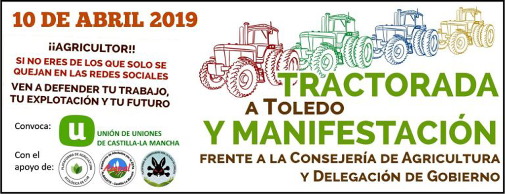 Unión de Uniones de Castilla-La Mancha, junto con las Plataformas en Defensa de la Agricultura Ecológica, Damnificados por la Plaga de Conejos y Afectados por la ZEPA han convocado para el miércoles 10 de abril próximo una tractorada y manifestación en Toledo, para reivindicar la adopción de un conjunto de medidas que deberían adoptarse en la próxima legislatura para mejorar las condiciones de trabajo de los profesionales del campo y los habitantes de los municipios rurales de la región. Así lo han anunciado sus responsables en rueda de prensa en el día de hoy.