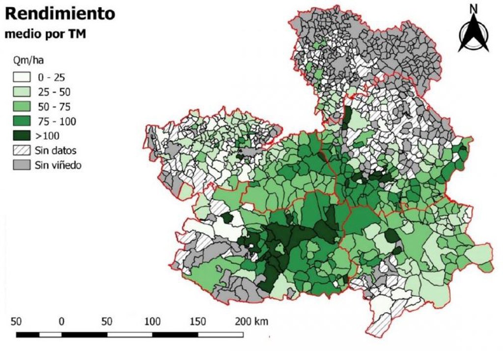 Relación del rendimiento por hectárea y el término municipal según el Plan Estratégico Regional. Fuente: UCLM