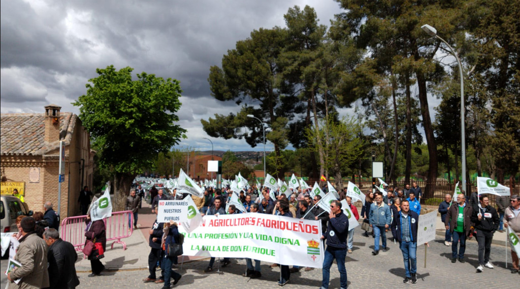 En número de unos 1.200 los agricultores y ganaderos convocados por Unión de Uniones de Castilla-La Mancha y las Plataformas de Agricultura Ecológica, Damnificados por la Plaga de Conejos y Afectados por la ZEPA se han manifestado hoy frente a las puertas de la Consejería de Agricultura en Toledo y ante la Delegación del Gobierno para reclamar, de cara a la próximos legislatura, la atención política hacia el sector agrario y el medio rural de la región. La manifestación ha estado precedida por la llegada a la capital de la región de cerca de una treintena de tractores en apoyo a la misma.