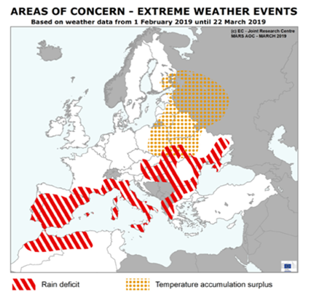 Ya en el boletín de seguimiento de cultivos de la Unión Europea de finales del mes de marzo se advertía una carencia de precipitaciones en la cuenca mediterránea que viene a corroborar lo acontecido hasta la fecha.