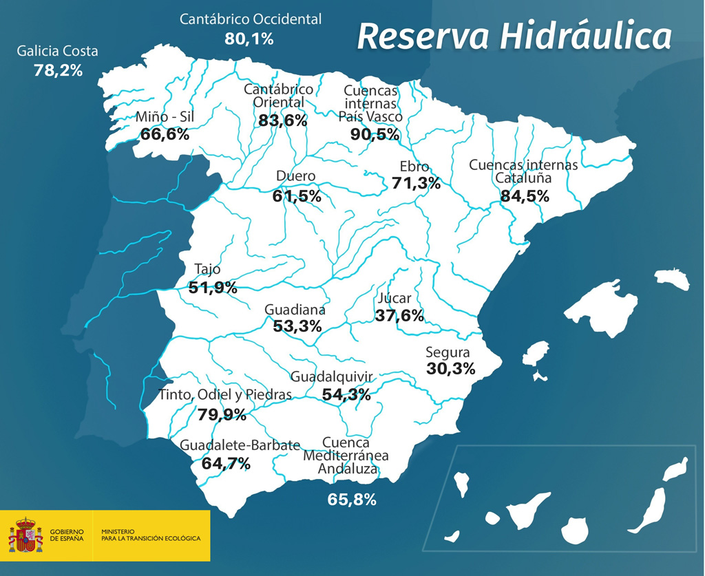 La reserva hidráulica española está al 57,7 por ciento de su capacidad total. Los embalses almacenan actualmente 32.388 hectómetros cúbicos (hm³) de agua, aumentando en la última semana en 175 hm³ (el 0,3% de la capacidad total de los embalses).