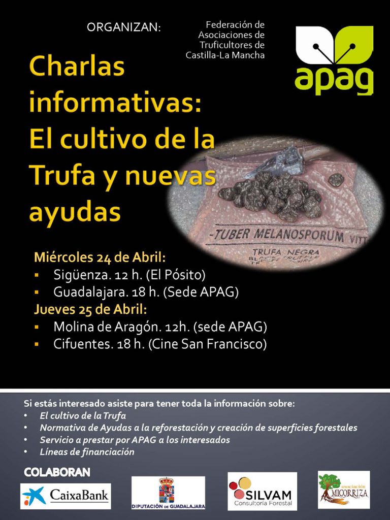 Tras la reciente publicación en el Diario Oficial de Castilla-La Mancha de la convocatoria de ayudas para la reforestación y creación de superficies forestales, la Asociación Provincial de Agricultores y Ganaderos (APAG) de Guadalajara, junto con la Federación de Truficultores de Castilla-La Mancha, ha organizado varias reuniones en la provincia con el fin de informar sobre el cultivo de la trufa y esta nueva línea de ayudas que se ha puesto en marcha desde la Consejería de Agricultura, Medio Ambiente y Desarrollo Rural.
