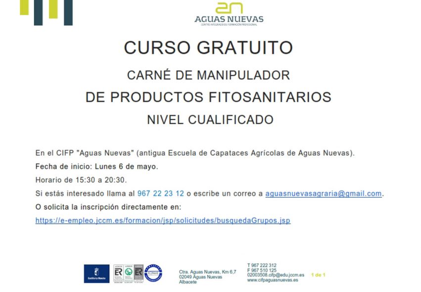 El Centro Integrado de Formación Profesional ‘Aguas Nuevas’, de Albacete, va a realizar en mayo un curso gratuito para la obtención del carné de Manipulador de Productos Fitosanitarios (Nivel cualificado) financiado por la Consejería de Economía, Empresas y Empleo de Castilla-La Mancha. El curso está dirigido a personas desempleadas y ocupadas.