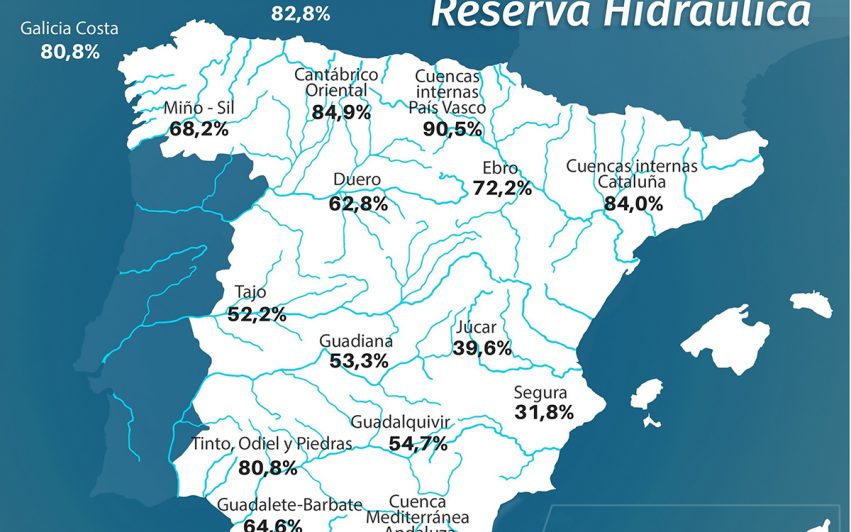 La reserva hidráulica española está al 58,4 por ciento de su capacidad total. Los embalses almacenan actualmente 32.779 hectómetros cúbicos (hm³) de agua, aumentando en la última semana en 390 hm³ (el 0,7% de la capacidad total de los embalses).