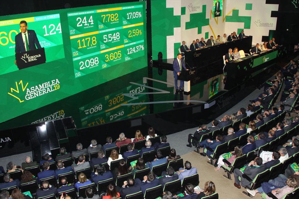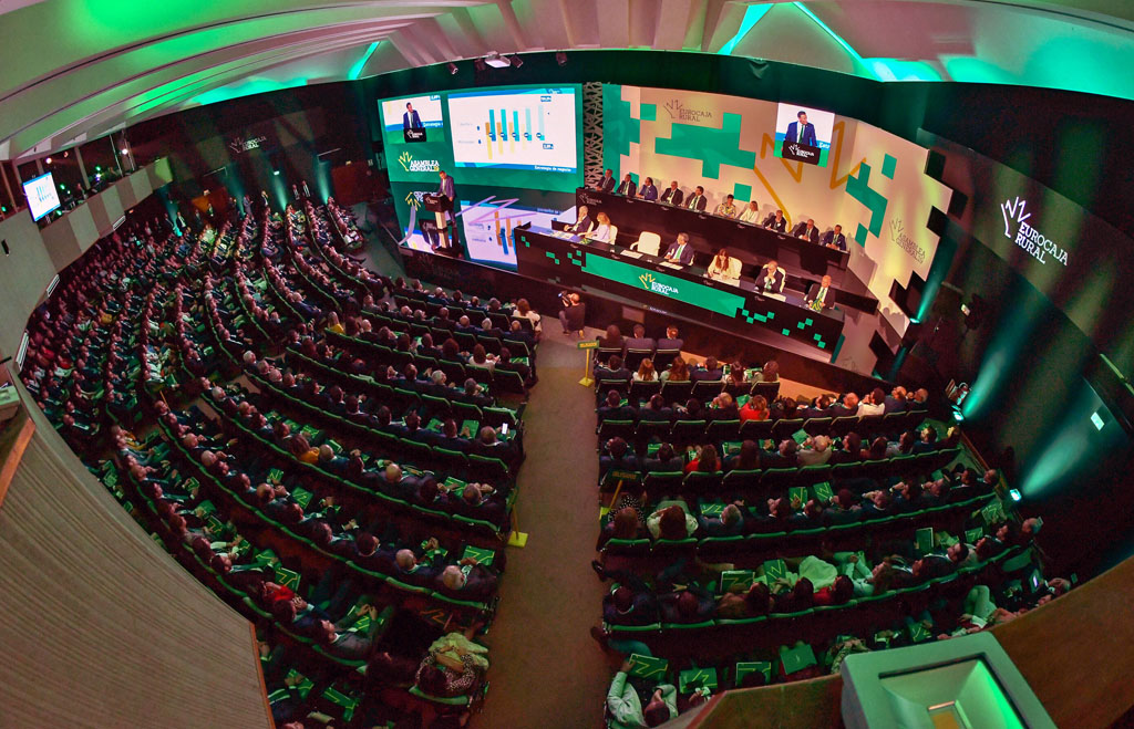 El Auditorio de los Servicios Centrales de Eurocaja Rural acogió una vez más la celebración de la Asamblea General, el órgano supremo de expresión de la voluntad social de la Entidad y su máximo acontecimiento anual, donde se dieron cita más de 1.000 personas entre delegados, socios, clientes, empleados, autoridades y representantes del tejido económico, social y financiero.