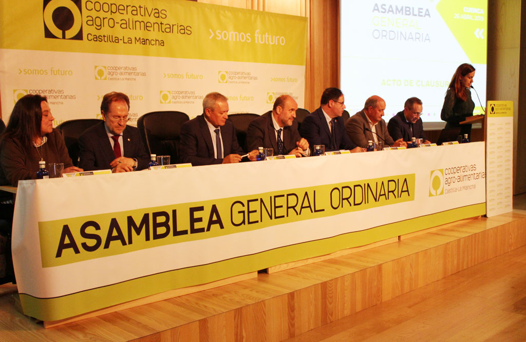 Cooperativas Agro-alimentarias Castilla-La Mancha ha celebrado en Cuenca su Asamblea General Ordinaria, que ha contado con la presencia de más de 250 presidentes, gerentes, técnicos y socios de cooperativas de la región. Además, al Consejo Rector de la organización, encabezado por su presidente, Ángel Villafranca, y su director, Juan Miguel del Real, le han acompañado en el acto de clausura el vicepresidente del gobierno de Castilla-La Mancha, José Luis Martínez Guijarro, el presidente de la Diputación de Cuenca, Benjamín Prieto, y el teniente de alcalde del Ayuntamiento de Cuenca, Julián Huete.