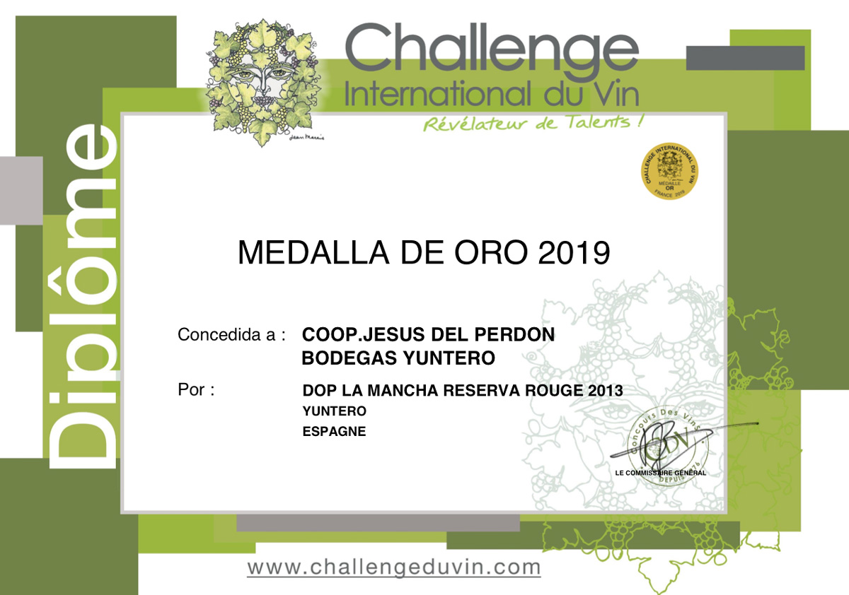 El tinto Yuntero Reserva 2013 ha recibido una medalla de oro, siendo la única medalla de oro otorgada a un reserva con Denominación de Origen La Mancha (DO La Mancha). Bodegas Yuntero también ha recibido una medalla de plata por su vino blanco Epílogo Sauvignon Blanc, de la añada 2018.