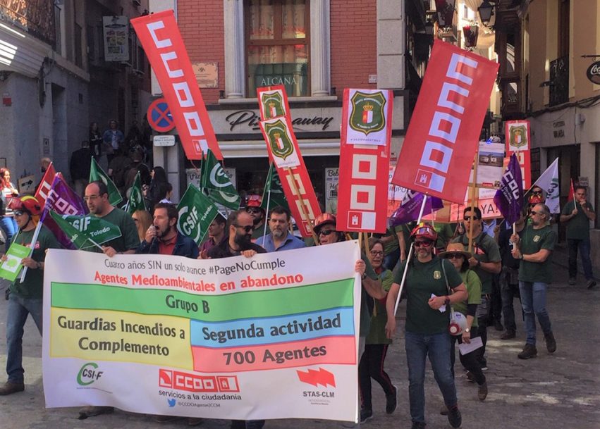 Unos 150 agentes medioambientales de Castilla-La Mancha se han manifestado este jueves en Toledo convocados por los sindicatos CCOO, CSIF y STAS, para denunciar una vez más el incumplimiento por parte del Gobierno regional de todos los compromisos asumidos con el colectivo para empezar a revertir los recortes sufridos durante la legislatura de Cospedal.