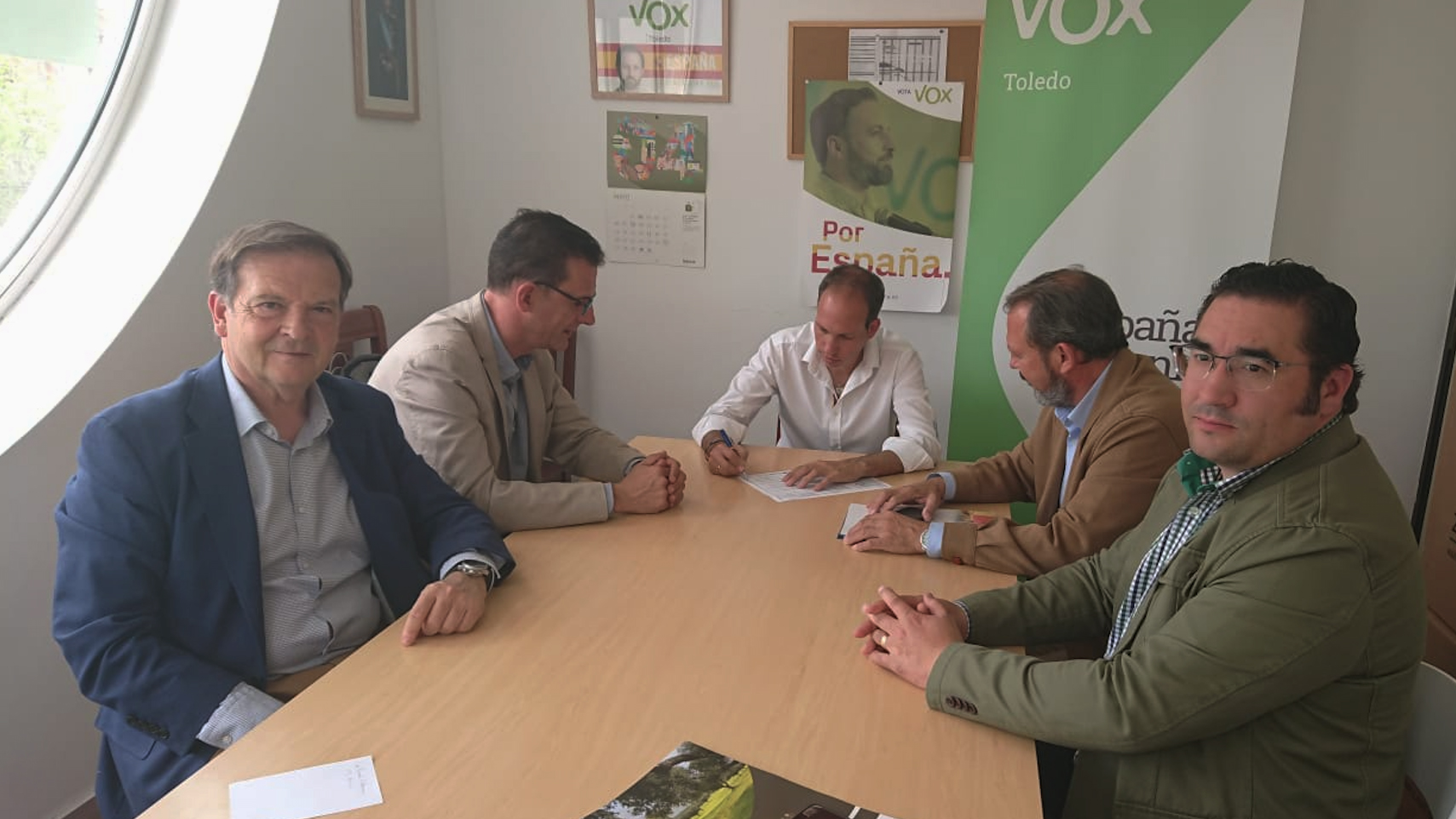 En la firma, junto al candidato de VOX, han participado los presidentes de la Federación de Caza de Castilla-La Mancha; Agustín Rabadán, de APROCA; Luis Fernando Villanueva y de ADEMAC, Alberto Saiz.