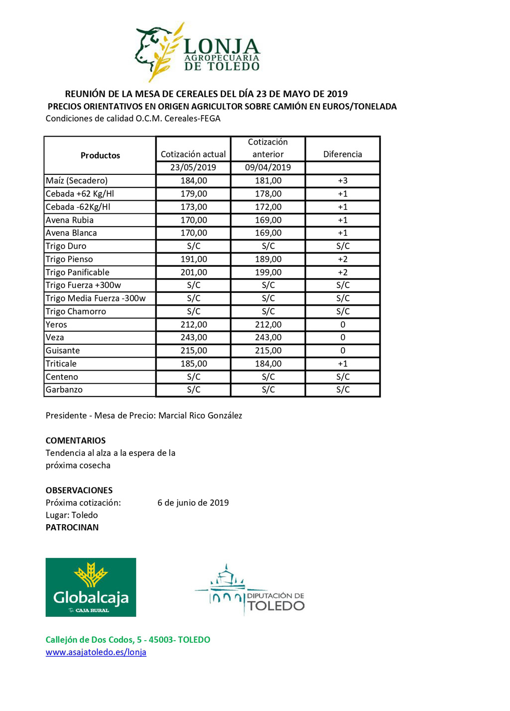 Lonja Agropecuaria de Toledo. Cereales. 23-Mayo-2019