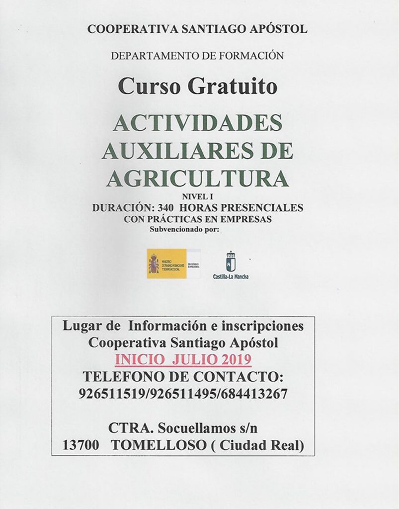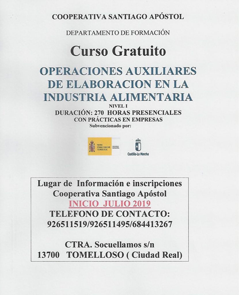 La Cooperativa Santiago Apóstol de Tomelloso ha organizado, a través de su departamento de formación dos cursos gratuitos, que comenzarán en julio. Uno de ellos es sobre “Operaciones Auxiliares de Elaboración en la Industria Alimentaria” y el otro, de “Actividades Auxiliares de Agricultura”. Ambos están subvencionados por la Junta de Comunidades de Castilla-La Mancha y el Ministerio de Trabajo, Migraciones y Seguridad Social