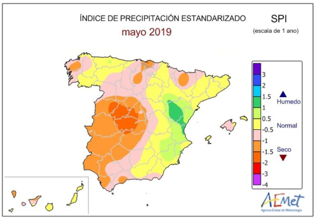 La escasez de precipitaciones en primavera ha continuado la tendencia del actual año hidrológico, que comenzó el pasado 1 de octubre de 2018. Desde entonces, en el conjunto de España ha llovido alrededor de un 15% por debajo de lo normal, pero en el actual año 2019 la situación de escasez de precipitaciones se ha acentuado, y desde el 1 de enero (año natural) las lluvias han estado un 25% por debajo del promedio 1981-2010. En ambos casos hablamos del tercer año hidrológico y natural más seco del siglo XXI.