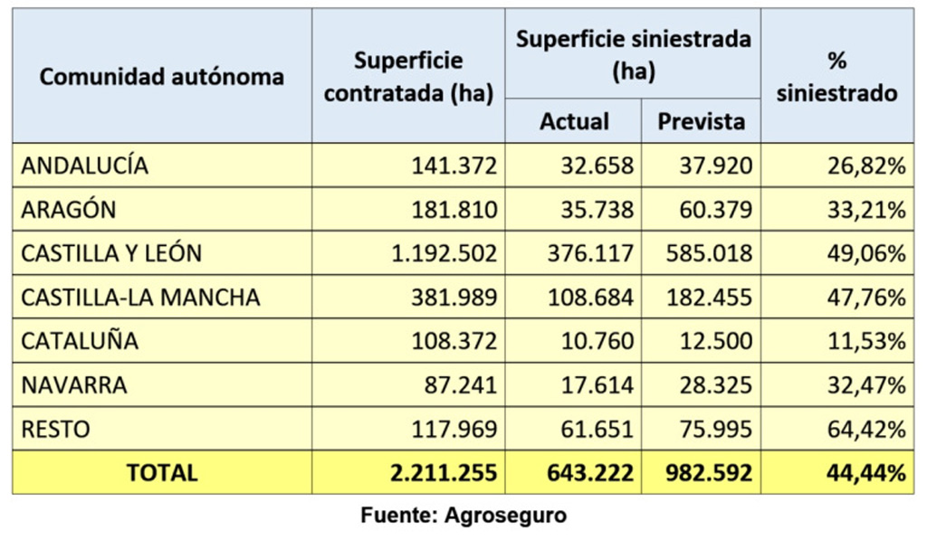 Hasta la fecha, la superficie total recibida alcanza las 643.000 ha siniestradas, siendo Castilla y León y Castilla-La Mancha las comunidades autónomas más afectadas. En el caso de Castilla-La Mancha de las 381.989 hectáreas aseguradas, se prevén daños en unas 182.455, aunque en la actualidad están afectadas 108.684. En caso de cumplirse estas previsiones la superficie afectada sería del 47,76%.