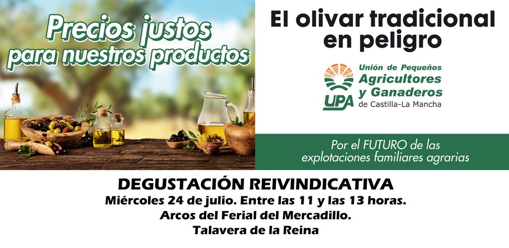El mercadillo de Talavera de la Reina de los miércoles será el escenario elegido por la Unión de Pequeños Agricultores y Ganaderos de Castilla-La Mancha para ofrecer una degustación reivindicativa de aceite de oliva virgen extra procedente del trabajo de agricultores de olivar tradicional; un trabajo que corre peligro debido a los altos costes de producción frente a los bajos precios a los que finalmente se vende el producto.