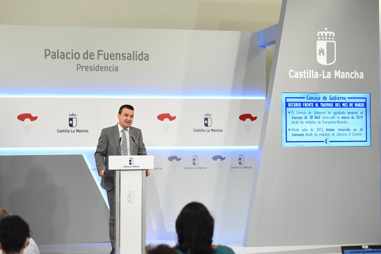 El consejero de Agricultura, Agua y Desarrollo Rural, Francisco Martínez Arroyo, así lo ha informado a los medios de comunicación durante la rueda de prensa que ha tenido lugar en el Palacio de Fuensalida para informar de los acuerdos adoptados por el Consejo de Gobierno de hoy, uno de ellos, interponer este recurso contra la decisión del Acuerdo de la Comisión Central de Explotación del trasvase Tajo-Segura en marzo de 2019.