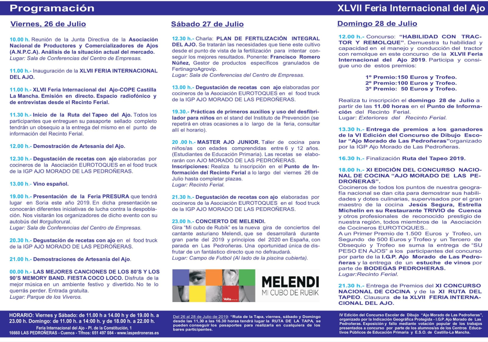 El fin de la campaña coincide con la celebración de la XLVII edición de la Feria Internacional del Ajo de Las Pedroñeras (FIDA) del 26 al 28 de julio, consolidada como la más importante en lo relacionado con el sector. Con multitud de actos programados, destaca algo novedoso como la degustación de recetas elaboradas con Ajo Morado por cocineros de la Asociación Internacional Euro-Toques en un food-truck. Estará instalado junto al stand de la IGP Ajo Morado de Las Pedroñeras, donde los asistentes también podrán probar a través de unas gafas de realidad virtual cómo se realizan las tareas de recolección y corte del producto. Una forma de dar a conocer a los más pequeños la que sigue siendo una forma de vida en la localidad y su comarca, en este caso, a través de las nuevas tecnologías.Un cultivo que ha servido como agente dinamizador a lo largo de diferentes generaciones y que sigue siendo motor económico. En esta línea, también tendrá lugar este viernes en Las Pedroñeras la presentación de la ‘Feria Presura’ que se celebrará en Soria este año. Los organizadores, con el autobús #orgullorural, darán a conocer diferentes iniciativas de lucha contra la despoblación.