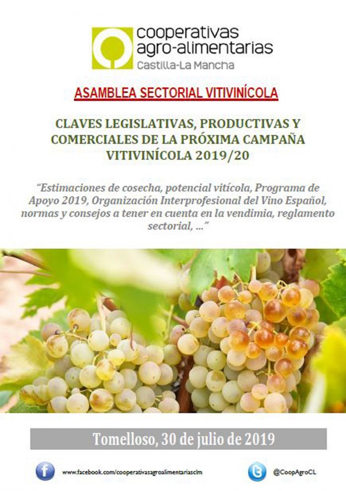 La Asamblea Vitivinícola estará dirigida por el portavoz de Vinos de Cooperativas, Juan Fuente, el viceportavoz, Francisco Garrido, y por el técnico sectorial vitivinícola, Bienvenido Amorós. En ella se abordarán las claves legislativas, productivas y comerciales de la próxima campaña vitivinícola 2019/2020.