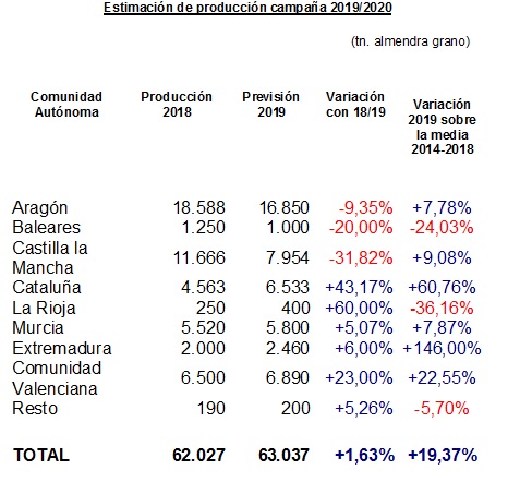 La producción de almendra 2019/20 será un 2% superior a la pasada y un 19% superior a la media de los cinco últimos años. Respecto a la primera estimación del mes de junio, se ha producido un incremento del 1% superándose las 63.000 toneladas de almendra grano.